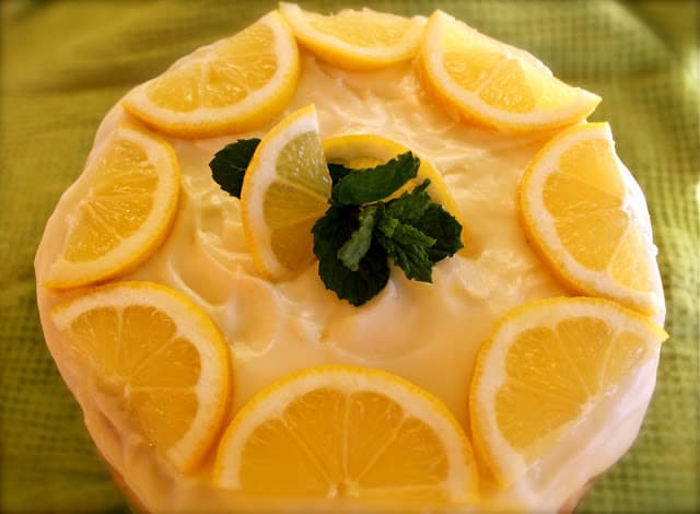Talk about a gorgeous cake! It’s the fresh lemon slices on top that do it for me. I can almost taste it.