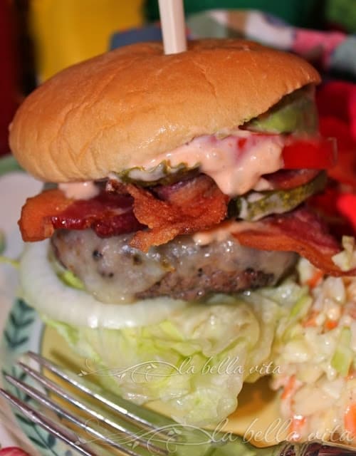 So Carolina with the slaw. They always ask if “you want slaw on it?” Meaning BBQ, but why not a burger. I would have to eat this bad boy with a fork too. Great burger Roz. Happy Independence Day.