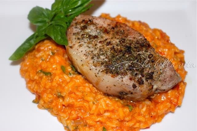 Although it is very common to serve risotto as a main dish for many people, for Mr. Meat and Potatoes, I simply baked some thick-cut, boneless pork chops sprinkled with a basic dried Italian seasoning blend for the entree. They are so brainless to prepare; just make sure that you don’t over-cook the chops beyond a half hour in a 350 degree oven.