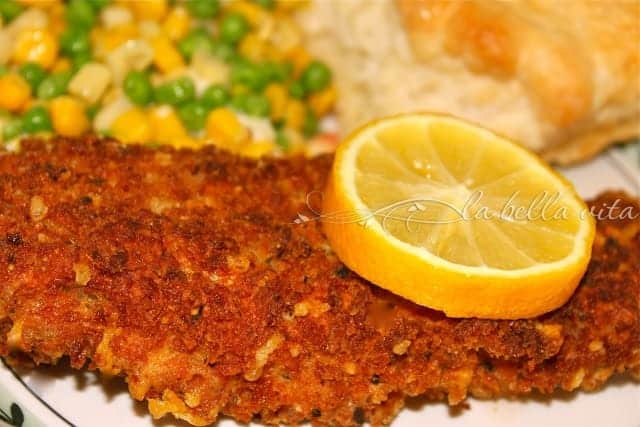 I used perch fillets for this entree, but you can use any mild-flavored white fish as well (tilapia, cod, flounder). If you can, try to use as freshly caught fish as you can. Serve this encrusted fish with lemon-garlic butter or your favorite tartar sauce on the side for dipping. This simple and easy fish pairs nicely with uncomplicated, colorful, fresh vegetables as well.