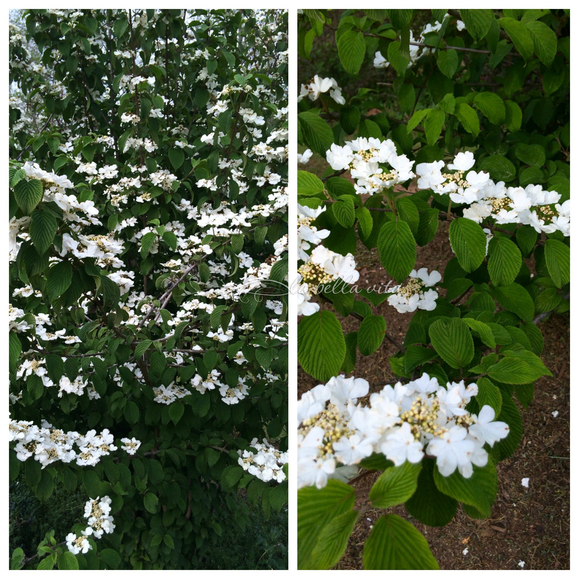 We planted several vibernum about 5 years ago and they are finally taking off after not blooming for the first few years of setting their roots. These will grow up to 20 feet tall and we’ll be trimming off the bottom for a better ‘tree’ form. But aren’t the blooms just delightful? They bloom in rows with a ‘lace-cap’ mini hydrangea look, but they are not hydrangeas. In the fall, they bear nice red berries for the birds.
