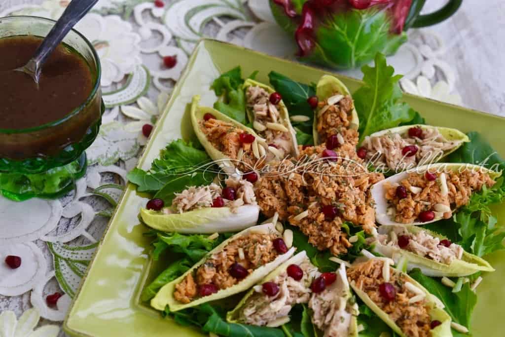 With the presentation of these salads on individual Belgian Endive leaves, sprinkled with some slivered almonds and pomegranate arils, it gets even better . . . prettier and healthier!