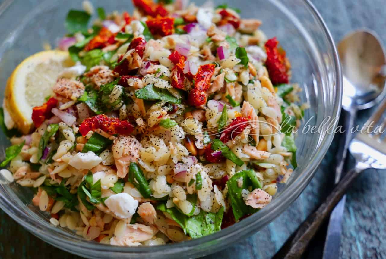 The delicate flavor of the tuna and orzo is balanced with the sharp, tangy flavors of sun-dried tomatoes, goat cheese, and red onions. The vinaigrette with dijon mustard and lemon-infused olive oil is amazing and adds a perfect splash of brightness to the salad.