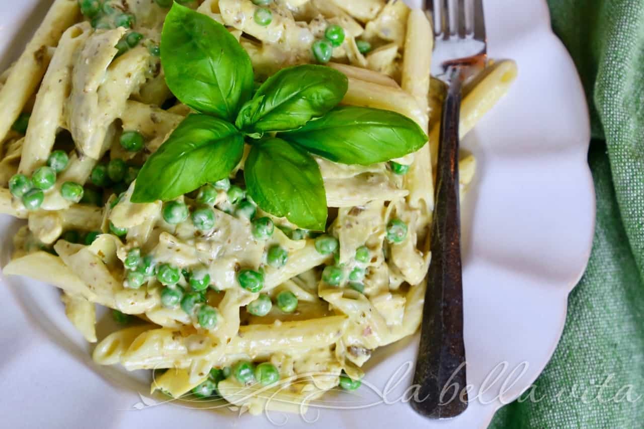 Creamy Artichoke, Pea and Pesto Pasta Salad