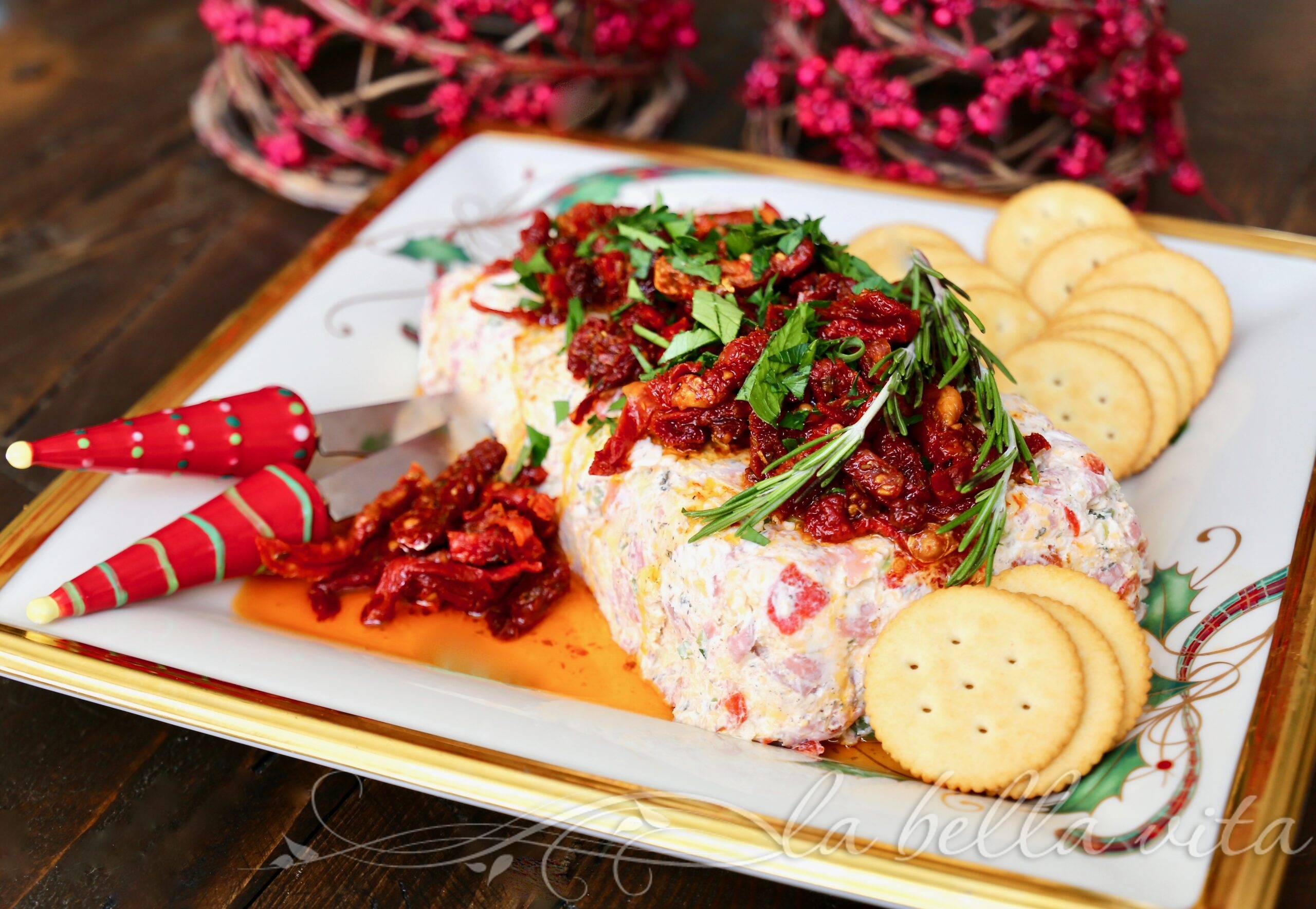 All of us are in need of some extra Christmas cheer this year. Just one look at this cheese log and after one bite, you’ll be well on your way to a cheerful time. Just look at how super festive this Italian cheese log is with all of the bright and vivid colors, ↑↑↑ you just can’t help but feel some of that holiday cheer!