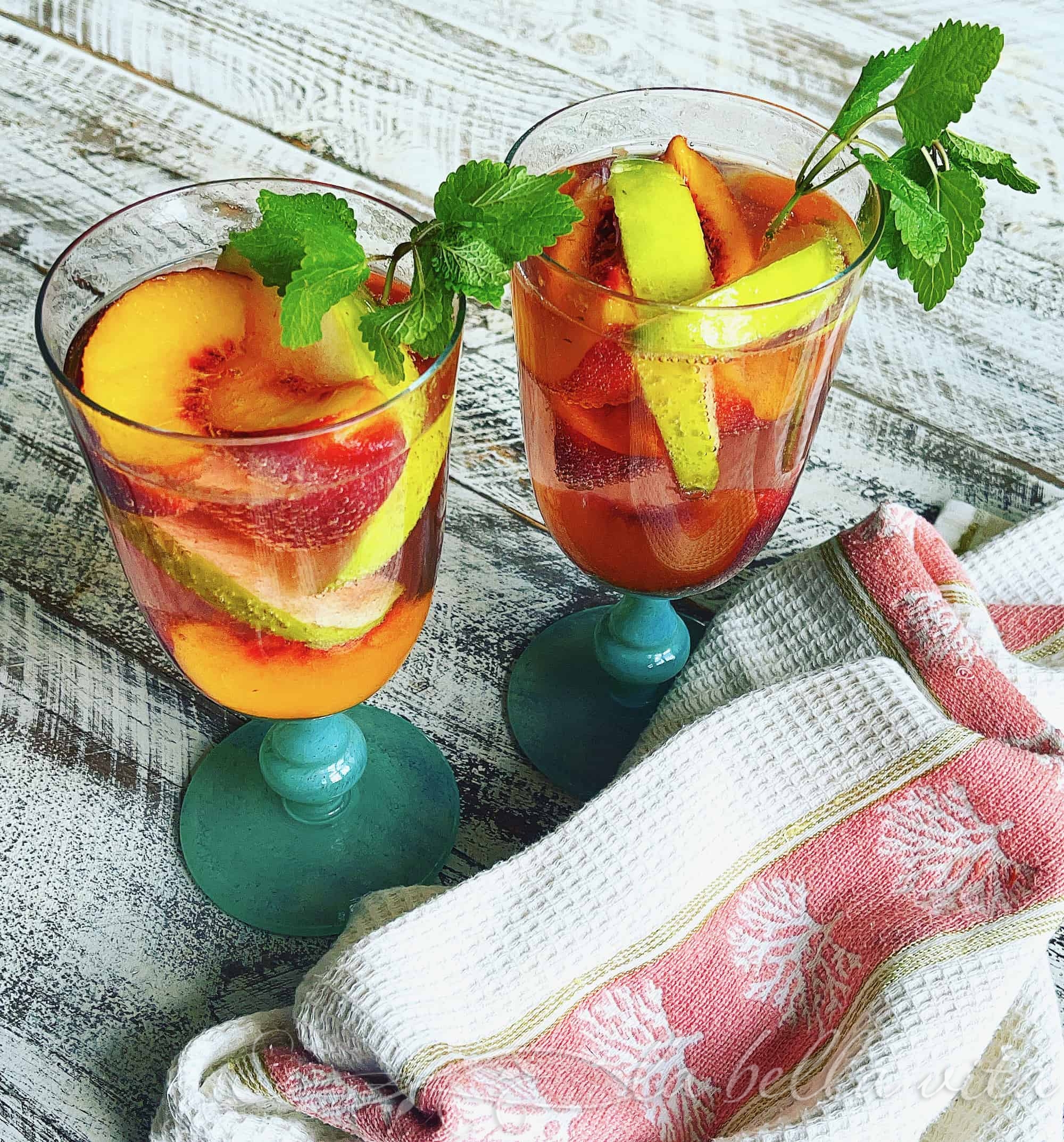 Ah, peaches are still in season and wow, are they ever sweet and juicy this year! We’ve really enjoyed them in cobblers, salads, crostate, and cakes (torte). I still needed to create something totally refreshing in the beverage category. What better way to use sweet peaches than in a freshly-infused Southern Peach Sangria? On top of that, I was in the the local booze store and on display was a huge variety of peach-infused vodka.