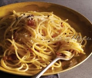 One thing that is agreed upon is that Roman Spaghetti Carbonara is a pasta recipe based on a delicious, ‘white sauce’ that develops from cheese (Pecorino Romano), eggs, ‘guanciale’ and black pepper. Â Even though the spaghetti pasta shape is the one most traditionally used, you can also use bucatini as a close second choice.