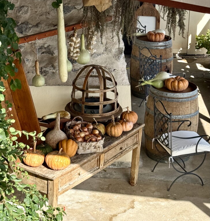 On the next floor down was a variety of pumpkins, gourds, and onions with rosemary and garlic hanging from above