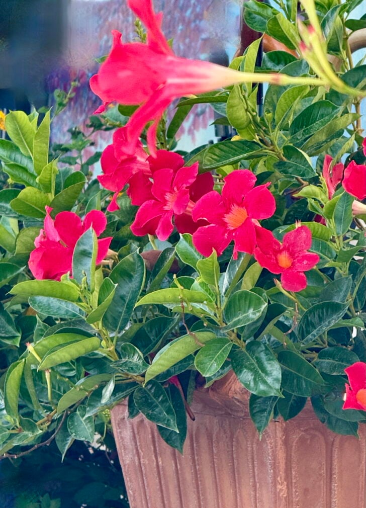 Bright, colorful Mandevilla still bloomed in October in the temperate coastal climate!
