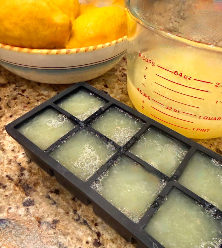 Once zested, juice the lemons and freeze the juice. You can do this in ice cube trays or you can purchase larger cube trays, such as these that I also use to freeze pesto in. They’re GREAT!